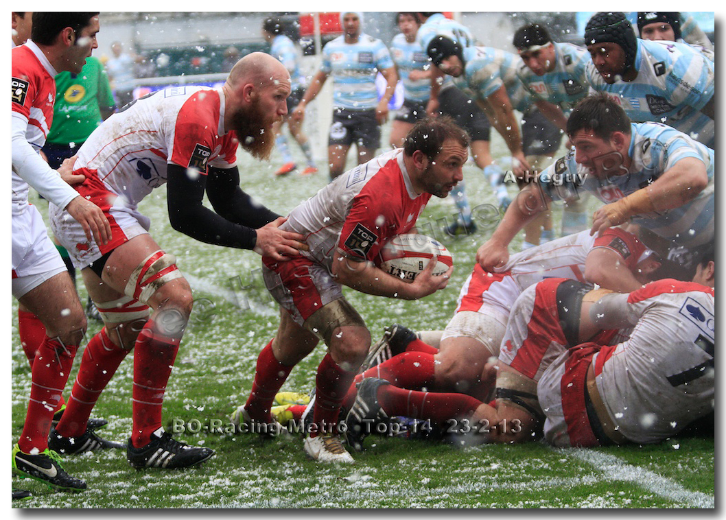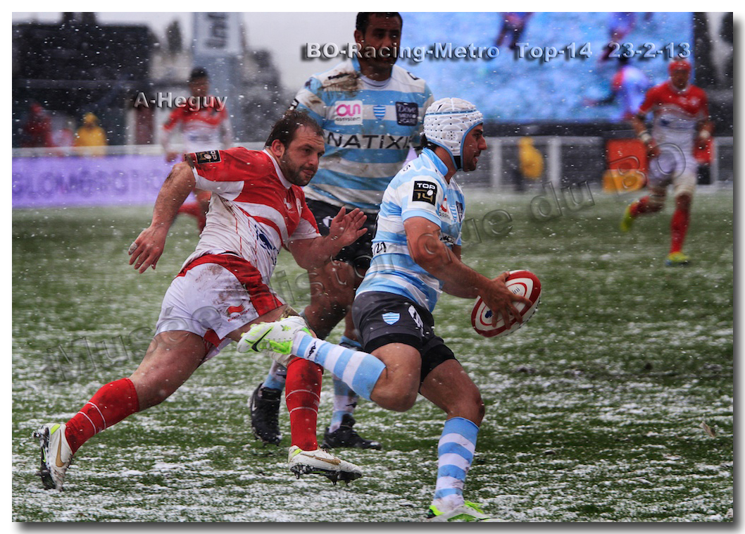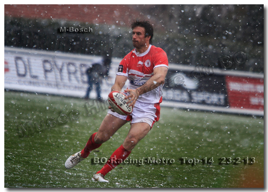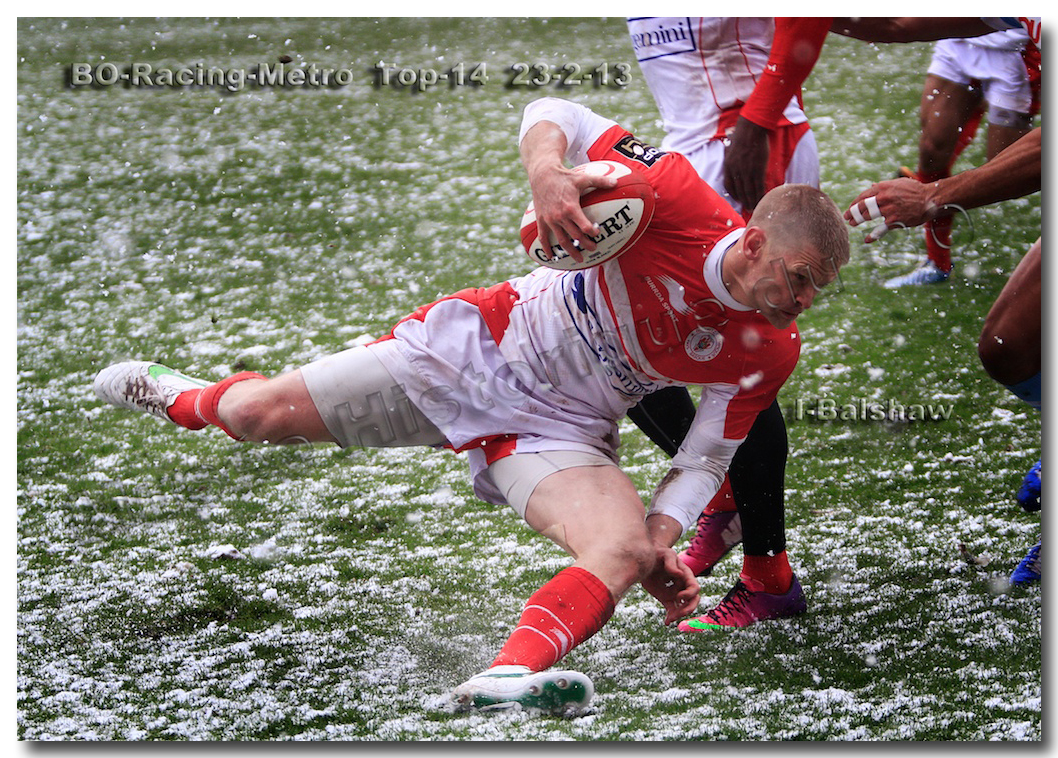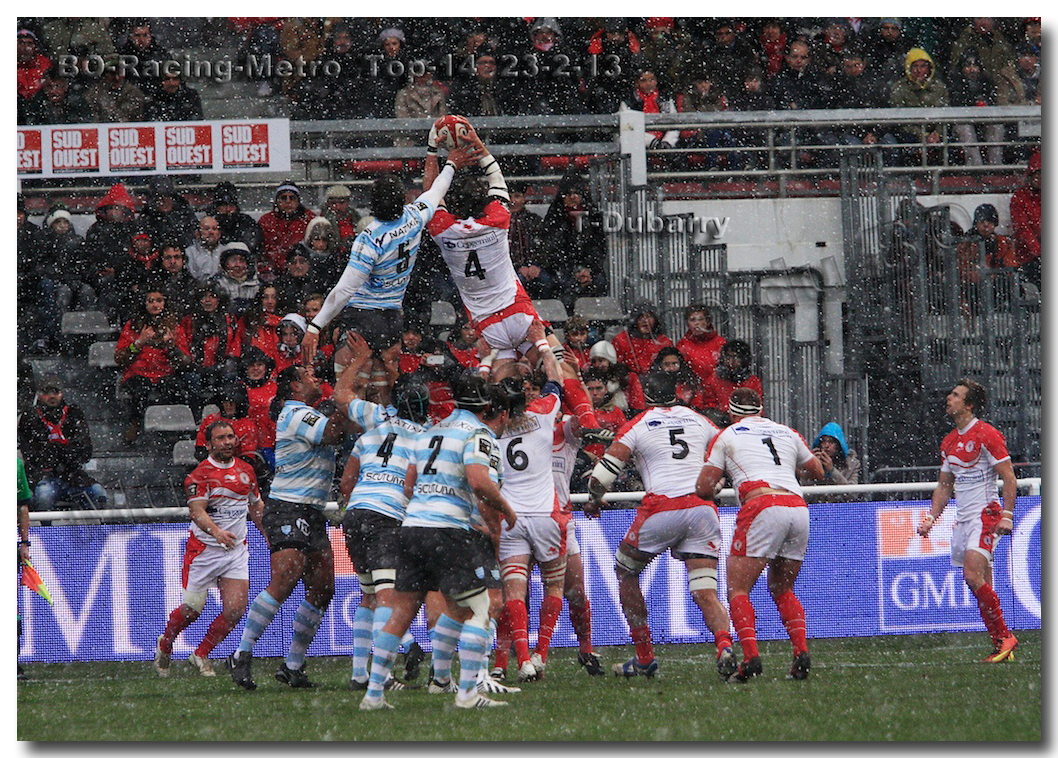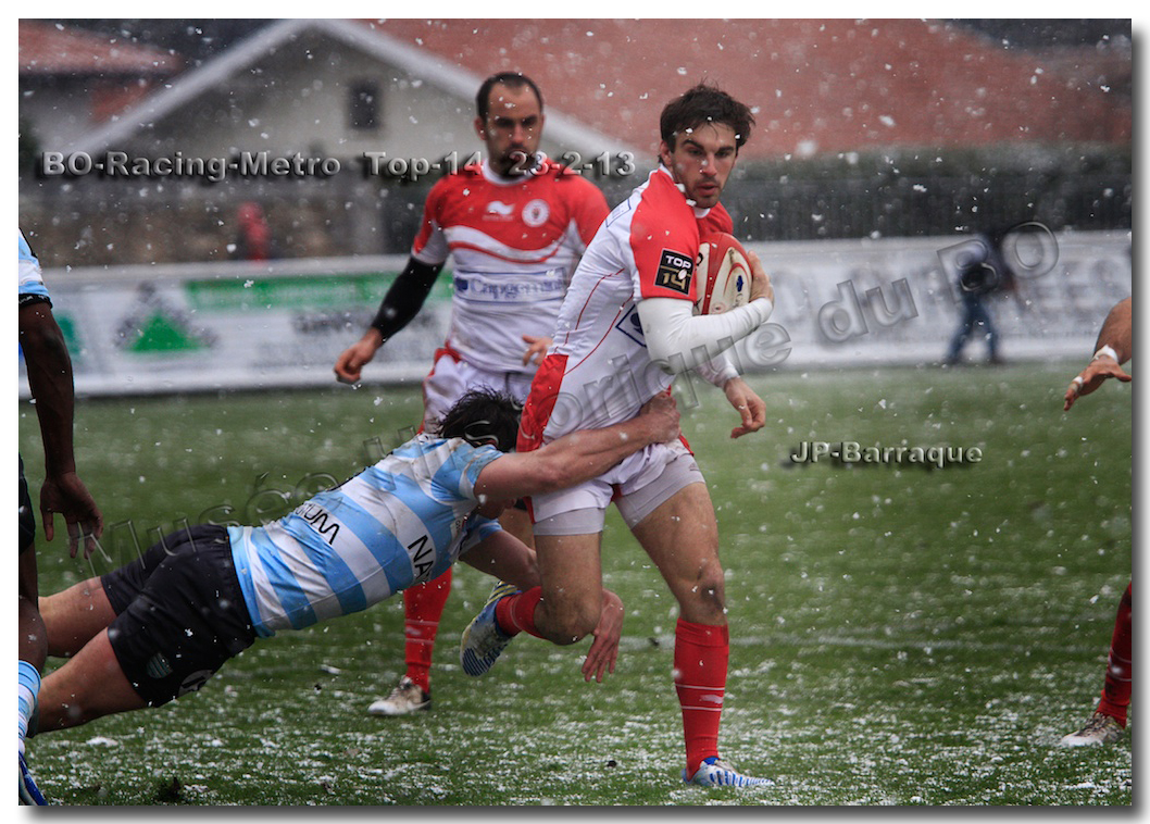 Après un long tunnel de huit matches disputés le soir, souvent le vendredi mais toujours son pluie, le déluge, dans le lac d’Aguilera, chacun se félicitait d’assister à BOPB-Racing-Métro 92 , un samedi après-midi. Décidemment, les dieux de la météo avaient décidé de marquer d’une pierre blanche cette rencontre. En fait de pierre blanche, c’est la neige qui fera son apparition sur la pelouse d’Aguilera. Un beau manteau blanc sous lequel, les derniers espoirs du BOPB de faire partie des six barragistes du Top 14 vont être ensevelis. Que faire devant la domination des Parisiens ? Les Rouge et Blanc vont de toutes leurs forces résister jusqu’à ce que Manuel Carizza, l’ex-biarrot vienne contrer Damien Traille dans les 22m biarrot. Le ballon filant dans l’en-but, Sébastien Descons, le numéro neuf parisien plongea pour aplatir. Arbitrage video ! L’essai était accordé. Y avait-il de la neige sur l’écran de l’arbitre vidéo ? Après le match, Alexandre Ruiz fera son mea culpa, l’essai n’était valable. Revenu à sept points des Racingmen, les Biarrots à nouveau dans le match se trouveront distancés définitivement. Un jour de neige, ça fout les boules….