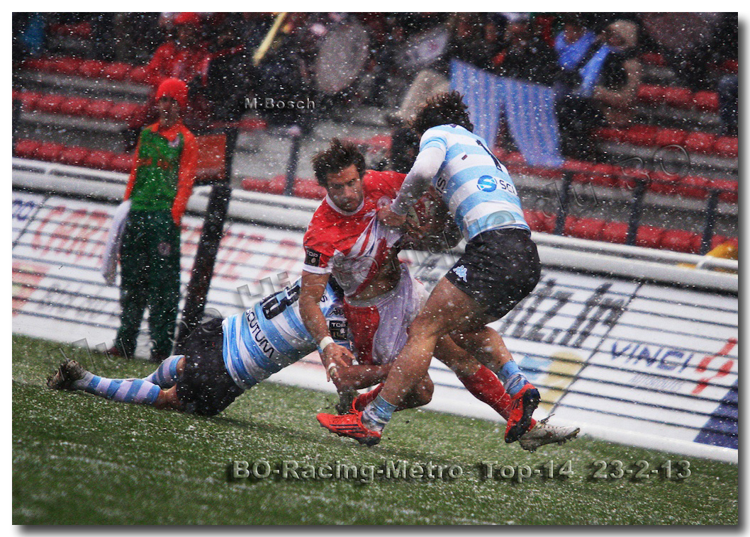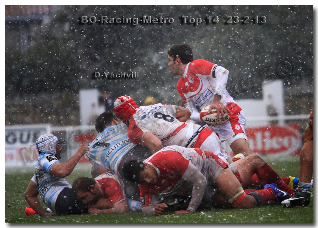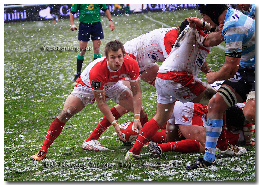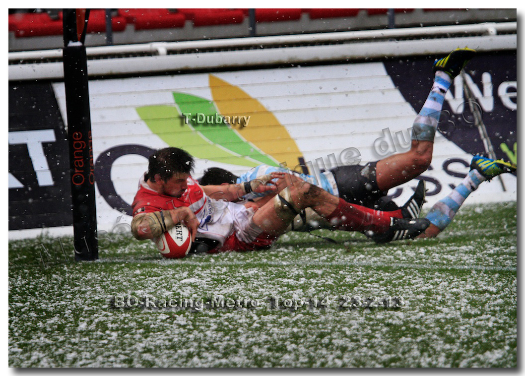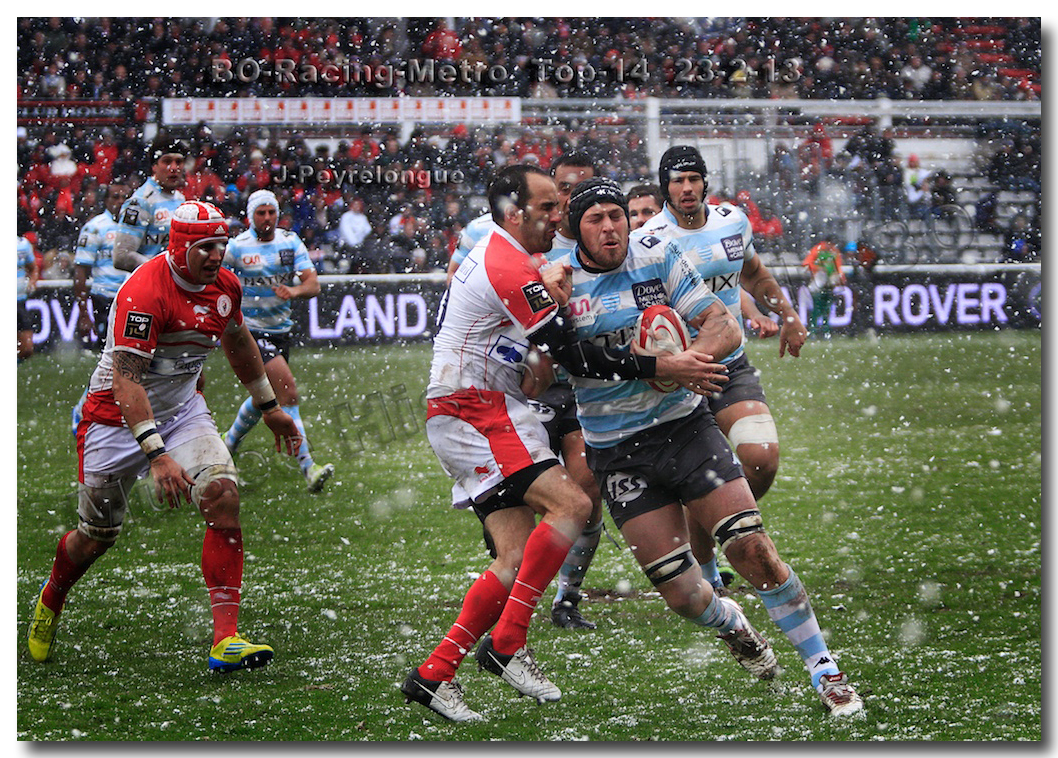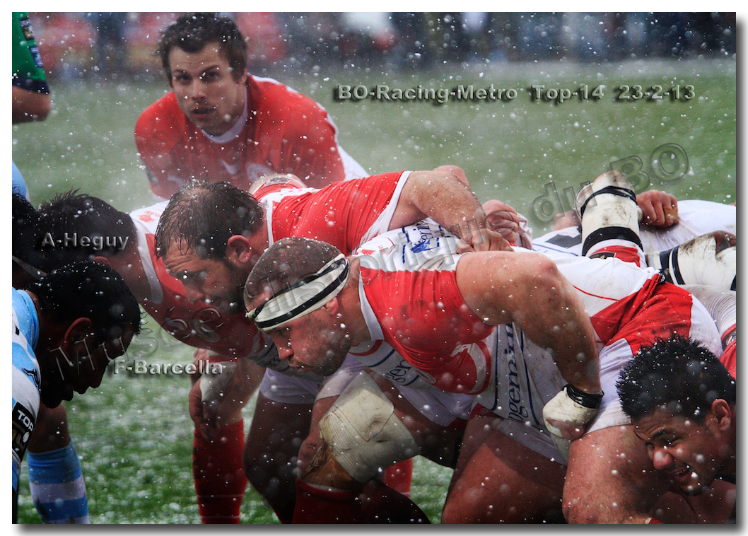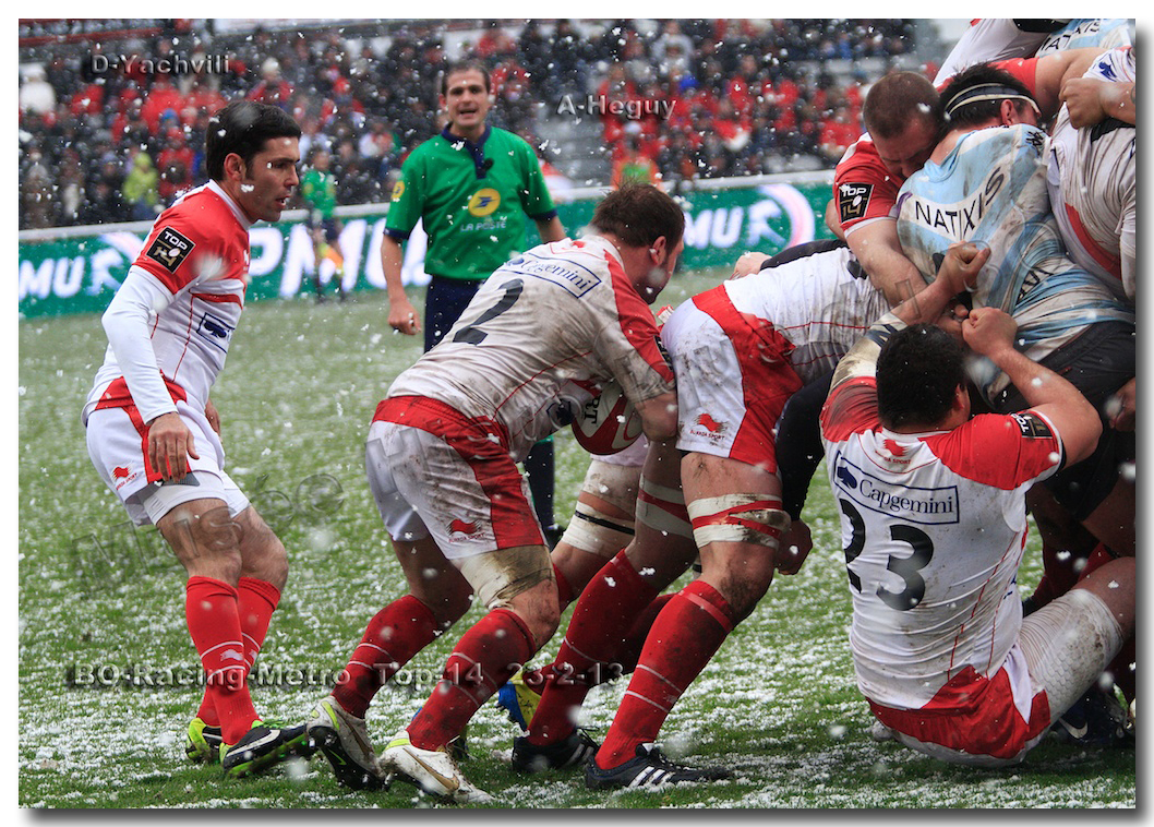 Après un long tunnel de huit matches disputés le soir, souvent le vendredi mais toujours son pluie, le déluge, dans le lac d’Aguilera, chacun se félicitait d’assister à BOPB-Racing-Métro 92 , un samedi après-midi. Décidemment, les dieux de la météo avaient décidé de marquer d’une pierre blanche cette rencontre. En fait de pierre blanche, c’est la neige qui fera son apparition sur la pelouse d’Aguilera. Un beau manteau blanc sous lequel, les derniers espoirs du BOPB de faire partie des six barragistes du Top 14 vont être ensevelis. Que faire devant la domination des Parisiens ? Les Rouge et Blanc vont de toutes leurs forces résister jusqu’à ce que Manuel Carizza, l’ex-biarrot vienne contrer Damien Traille dans les 22m biarrot. Le ballon filant dans l’en-but, Sébastien Descons, le numéro neuf parisien plongea pour aplatir. Arbitrage video ! L’essai était accordé. Y avait-il de la neige sur l’écran de l’arbitre vidéo ? Après le match, Alexandre Ruiz fera son mea culpa, l’essai n’était valable. Revenu à sept points des Racingmen, les Biarrots à nouveau dans le match se trouveront distancés définitivement. Un jour de neige, ça fout les boules….
