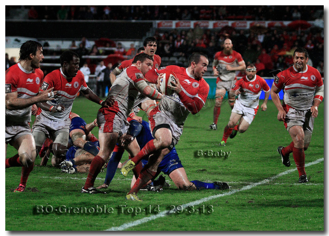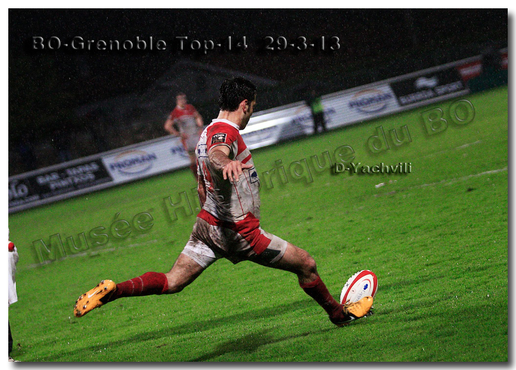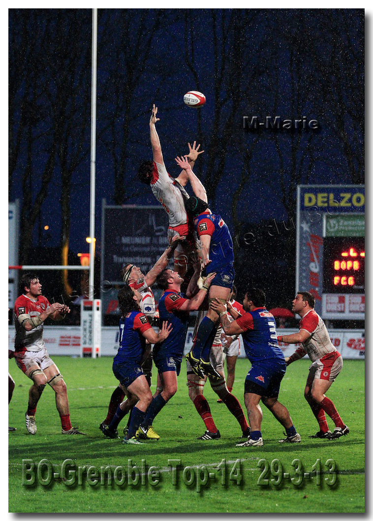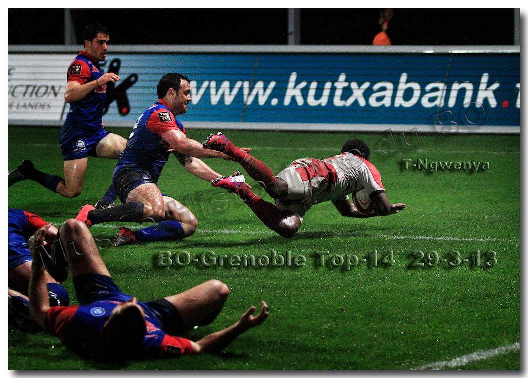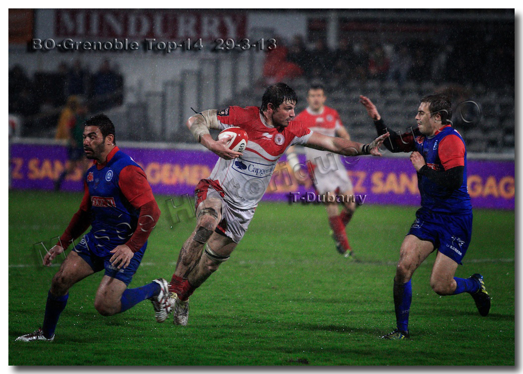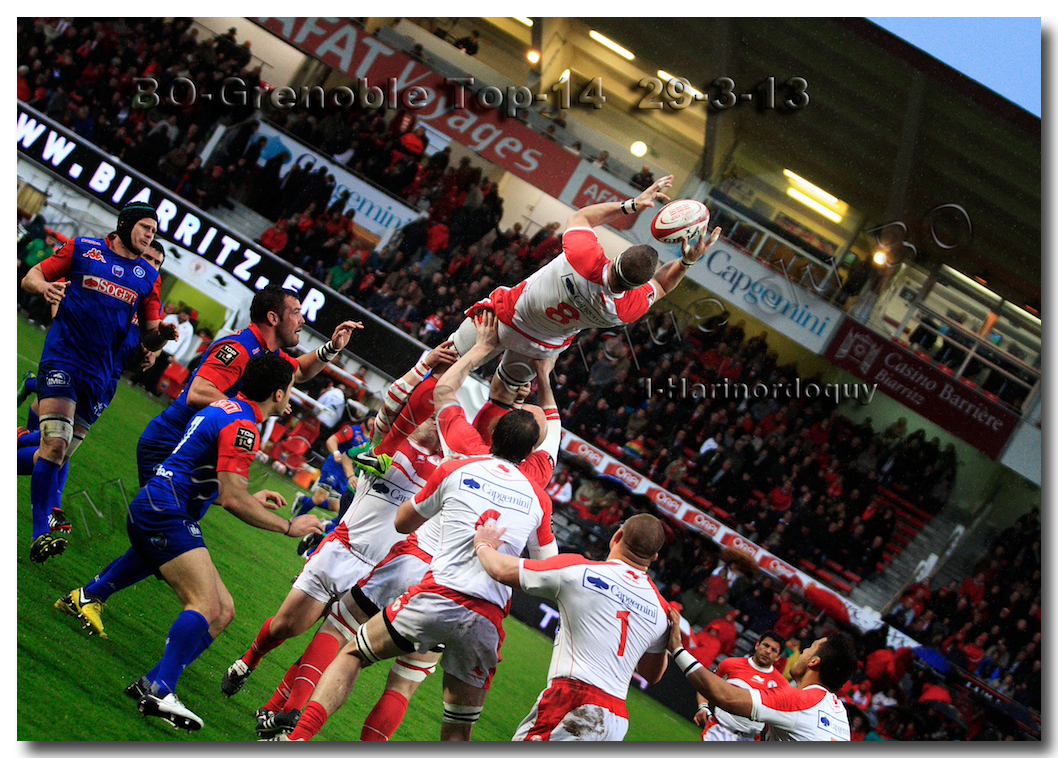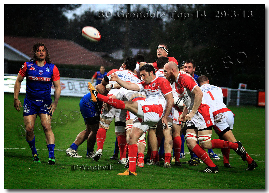 Il faisait une température printanière tout au long de la journée sur la Côte Basque. Trop beau, trop doux pour être vrai ! A l’heure de l’échauffement des équipes, patatras ! La pluie abonnée aux matches du BOPB arrivait sur Aguilera. Compagne habituelle des matches des Rouge et Blanc, elle allait à nouveau tout gâcher. Devant une équipe grenobloise accrocheuse, le BOPB se retrouvait même mené en début de deuxième mi-temps. S’appuyant sur une mêlée dominatrice, pourtant sanctionnée d’un essai de pénalisation dès la cinquième minute (allez comrendre les mystères de lamêlée !), les Rouge et Blanc allaient se détacher dans les vingt dernières minutes. Tout d’abord sur un côté fermé, Benoît Baby servait Eugen Staden pour Bosch qui décalait pour l’essai libérateur Takudzuwa N’Gwenya. C’était l’Evénément de la soirée. Depuis le 21 avril 2012 et un match face au Racing-Métro 92, « Zi » n’avait plus marqué dans son jardin d’Aguilera. Ironie de l’Histoire, presqu’un an après, il aplatissait au même endroit. Si l’assassin revient toujours sur le lieu de son crime, le chasseur d’essai semble en faire de même… Et puis à cinq minutes de la fin le chef d’œuvre est né : Dimitri Yachvili contrait un dégagement grenoblois. Le ballon roulait au sol, insaisissable sauf pour « Yachvilinho », rugbyman biarrot, devenu footballeur brésilien. D’une talonnade géniale , le numéro 9 mettait le ballon dans les bras d’Erik Lund qui avait senti le coup magique pour inscrire son premier essai pour le BOPB. De tels instants récompensent une heure et demie d’attente…sous la pluie.