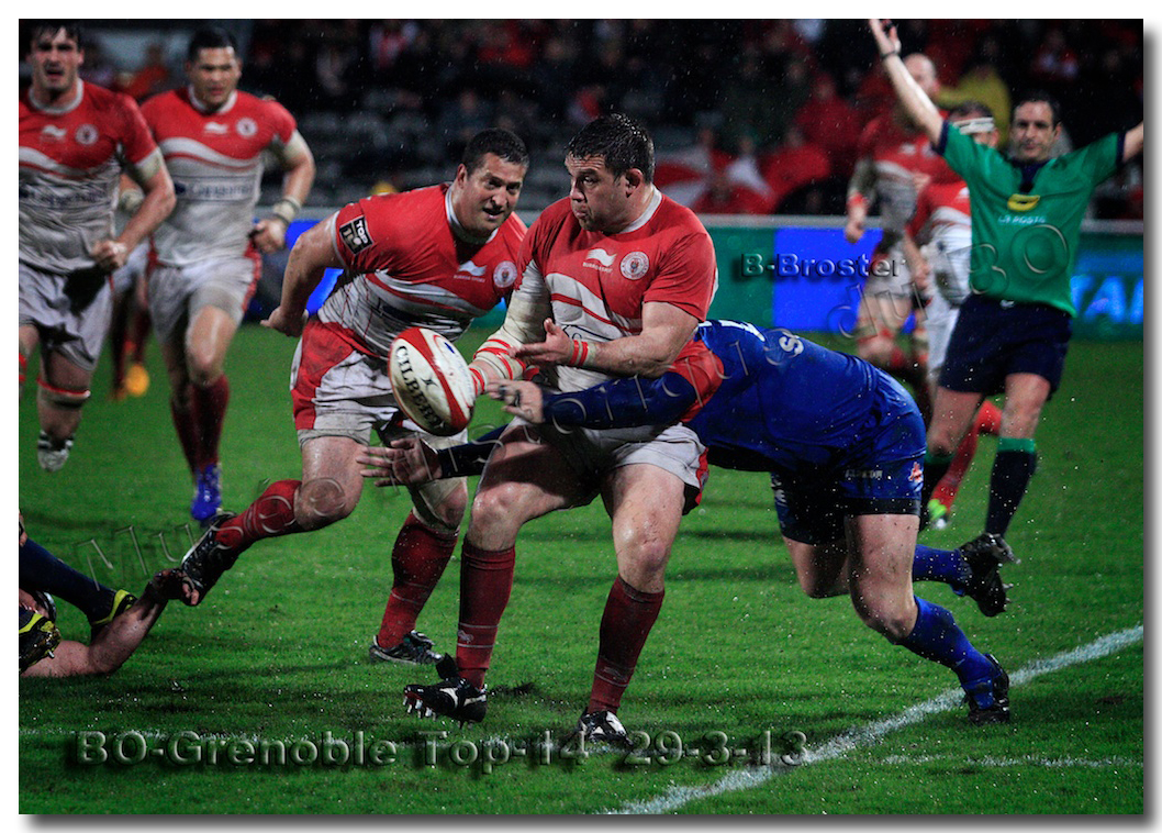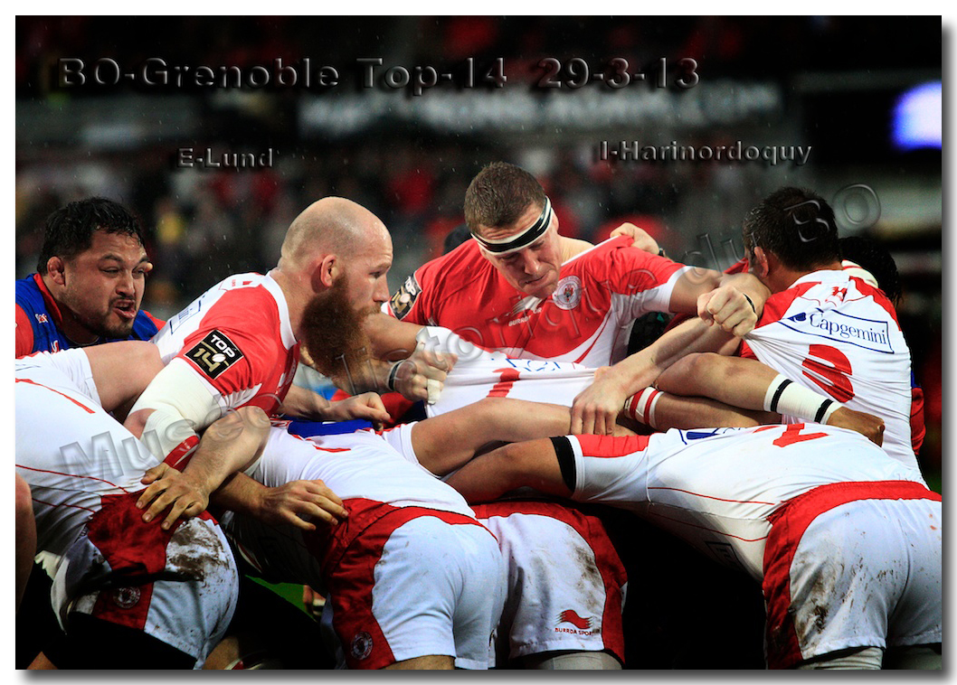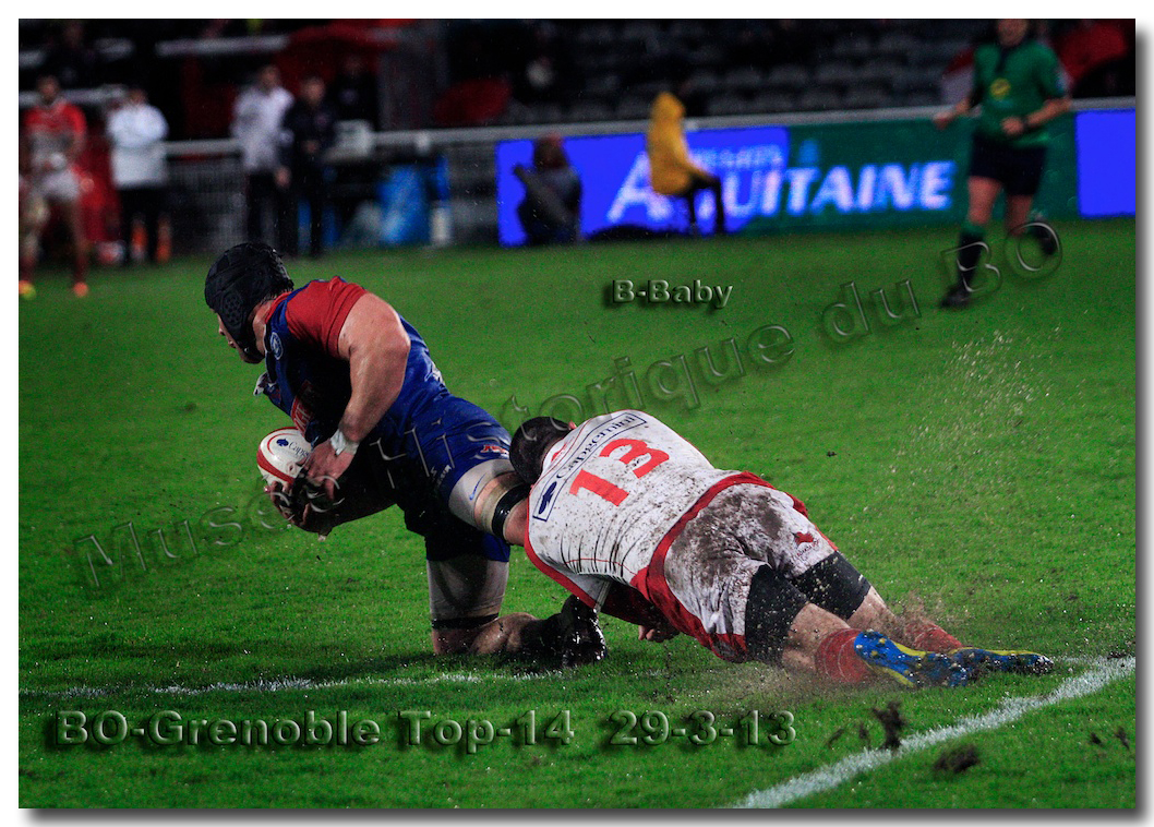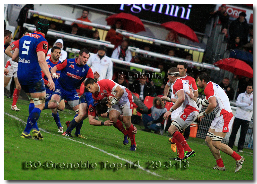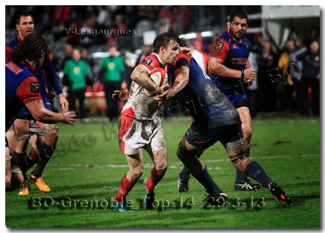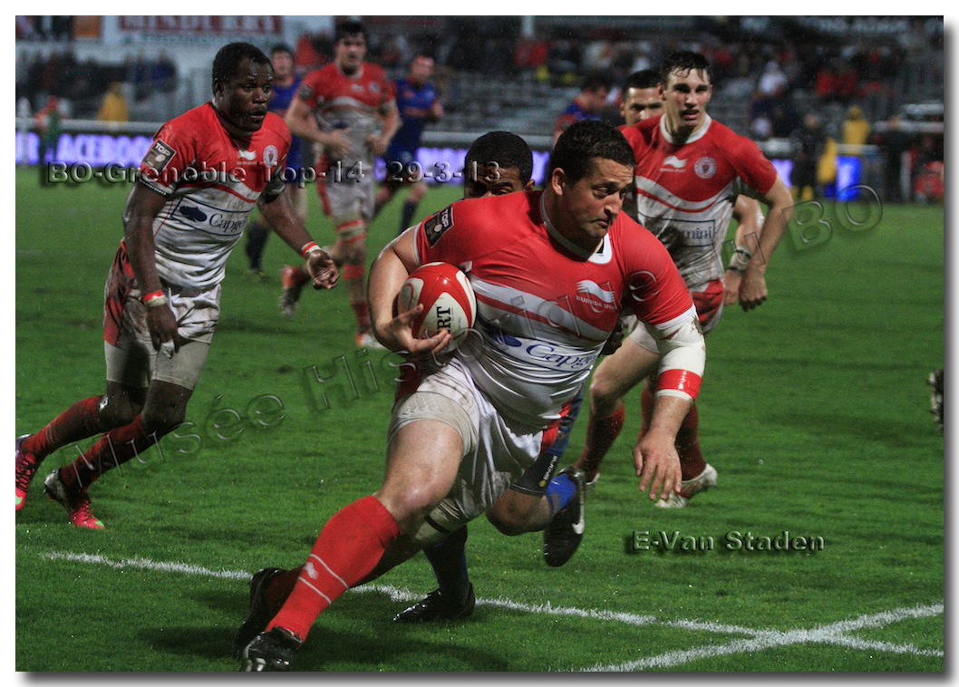 Il faisait une température printanière tout au long de la journée sur la Côte Basque. Trop beau, trop doux pour être vrai ! A l’heure de l’échauffement des équipes, patatras ! La pluie abonnée aux matches du BOPB arrivait sur Aguilera. Compagne habituelle des matches des Rouge et Blanc, elle allait à nouveau tout gâcher. Devant une équipe grenobloise accrocheuse, le BOPB se retrouvait même mené en début de deuxième mi-temps. S’appuyant sur une mêlée dominatrice, pourtant sanctionnée d’un essai de pénalisation dès la cinquième minute (allez comrendre les mystères de lamêlée !), les Rouge et Blanc allaient se détacher dans les vingt dernières minutes. Tout d’abord sur un côté fermé, Benoît Baby servait Eugen Staden pour Bosch qui décalait pour l’essai libérateur Takudzuwa N’Gwenya. C’était l’Evénément de la soirée. Depuis le 21 avril 2012 et un match face au Racing-Métro 92, « Zi » n’avait plus marqué dans son jardin d’Aguilera. Ironie de l’Histoire, presqu’un an après, il aplatissait au même endroit. Si l’assassin revient toujours sur le lieu de son crime, le chasseur d’essai semble en faire de même… Et puis à cinq minutes de la fin le chef d’œuvre est né : Dimitri Yachvili contrait un dégagement grenoblois. Le ballon roulait au sol, insaisissable sauf pour « Yachvilinho », rugbyman biarrot, devenu footballeur brésilien. D’une talonnade géniale , le numéro 9 mettait le ballon dans les bras d’Erik Lund qui avait senti le coup magique pour inscrire son premier essai pour le BOPB. De tels instants récompensent une heure et demie d’attente…sous la pluie.