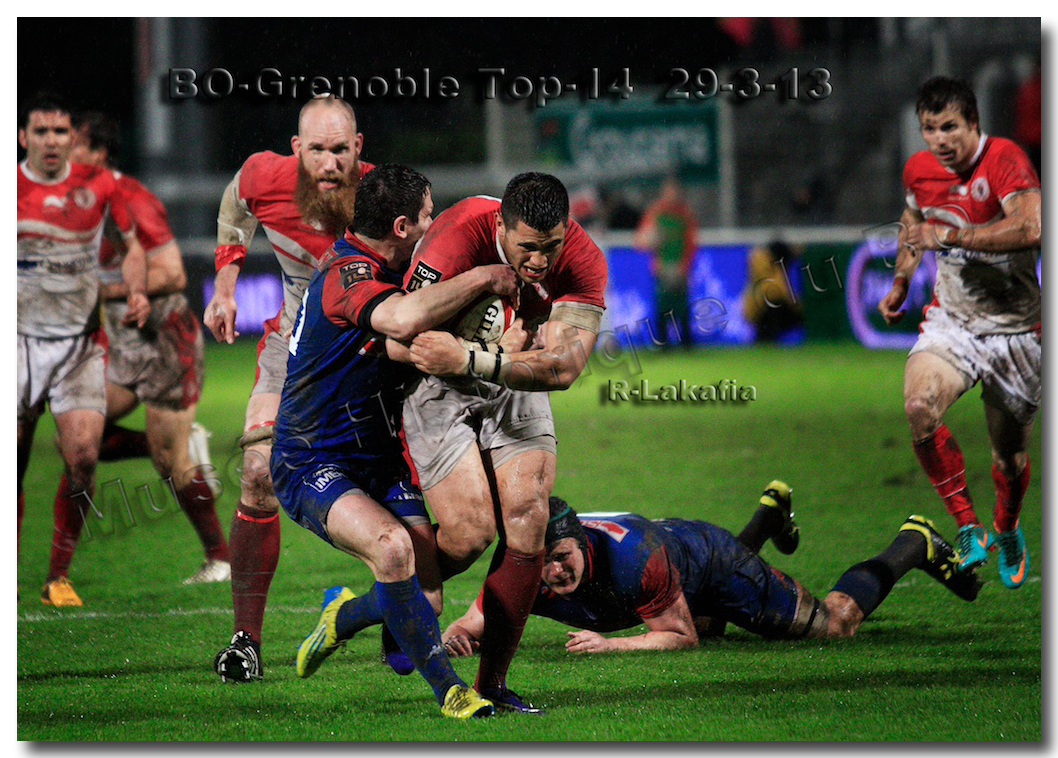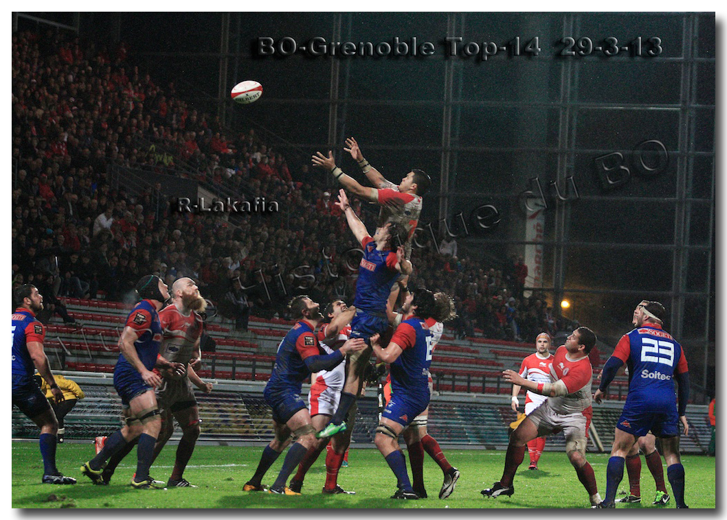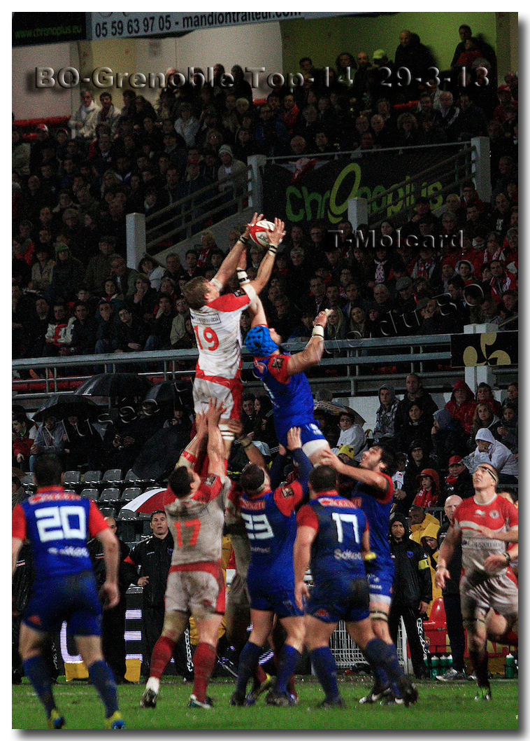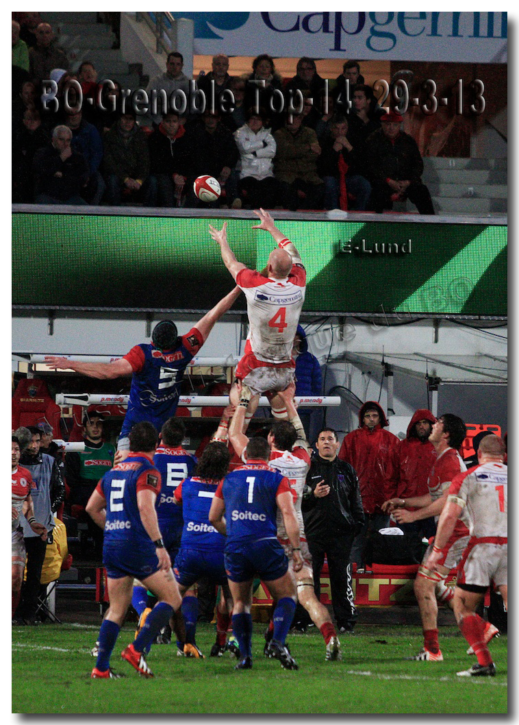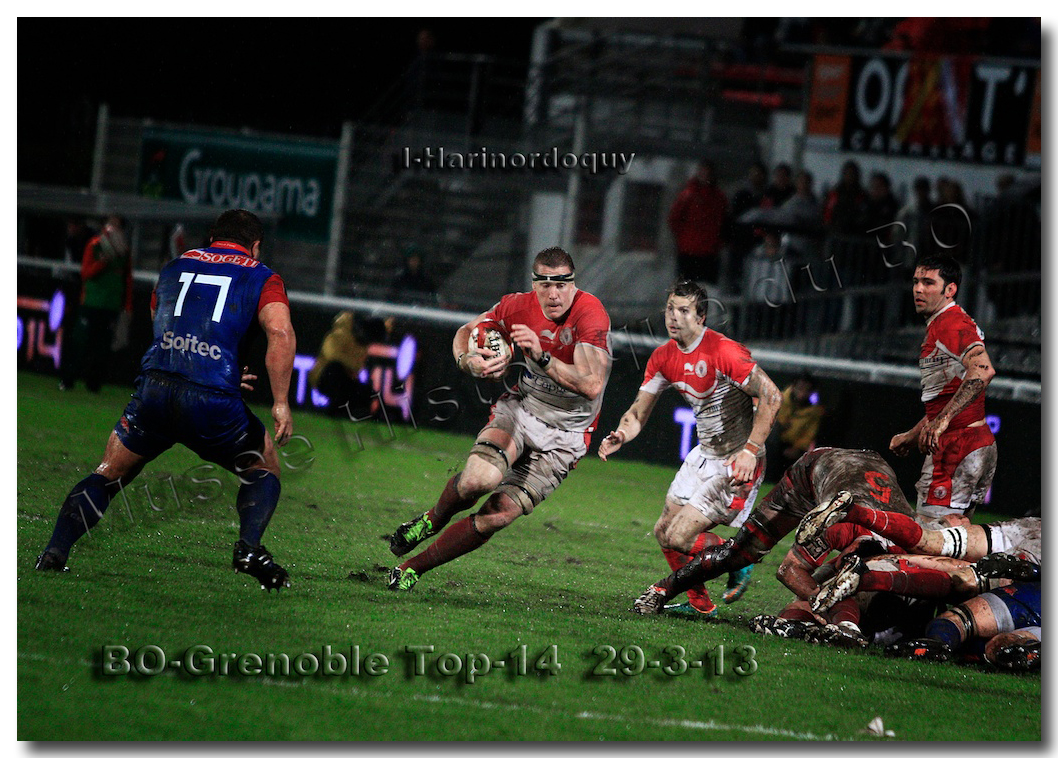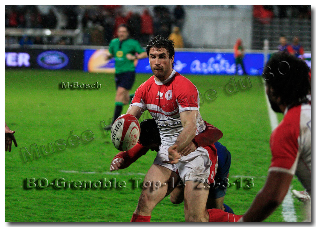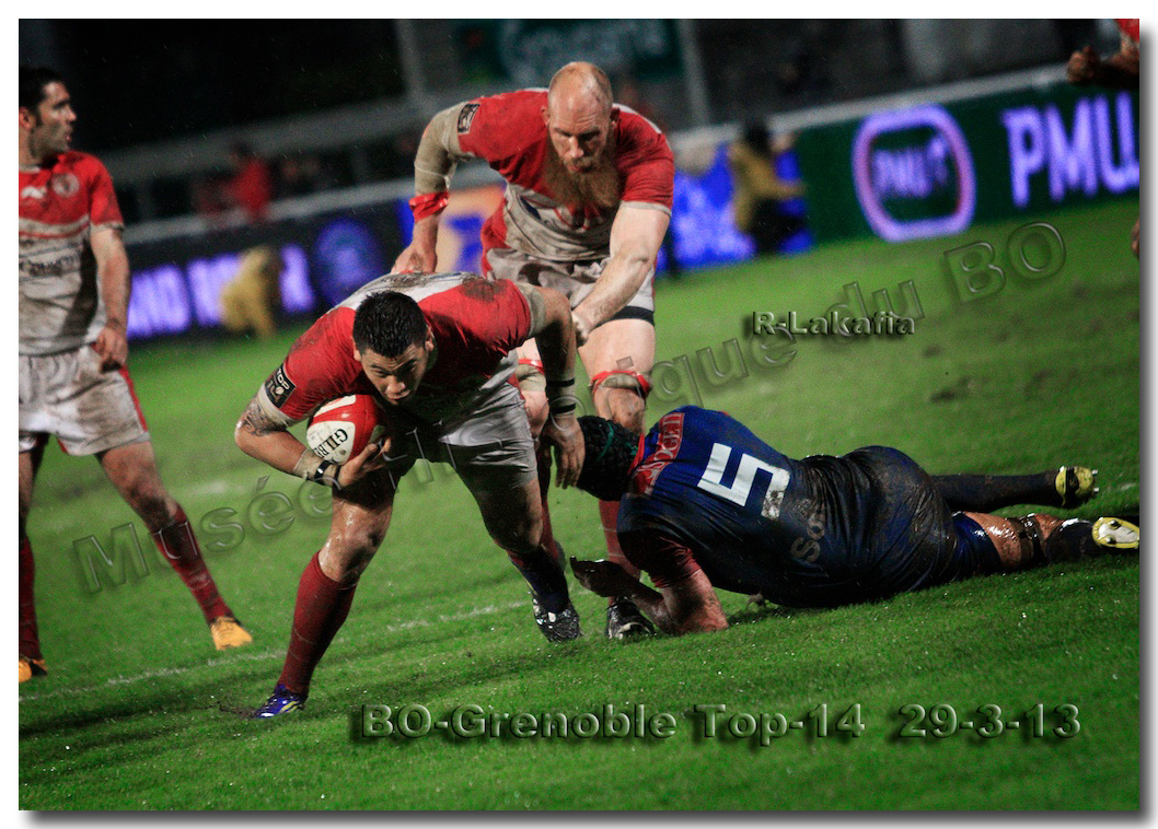 Il faisait une température printanière tout au long de la journée sur la Côte Basque. Trop beau, trop doux pour être vrai ! A l’heure de l’échauffement des équipes, patatras ! La pluie abonnée aux matches du BOPB arrivait sur Aguilera. Compagne habituelle des matches des Rouge et Blanc, elle allait à nouveau tout gâcher. Devant une équipe grenobloise accrocheuse, le BOPB se retrouvait même mené en début de deuxième mi-temps. S’appuyant sur une mêlée dominatrice, pourtant sanctionnée d’un essai de pénalisation dès la cinquième minute (allez comrendre les mystères de lamêlée !), les Rouge et Blanc allaient se détacher dans les vingt dernières minutes. Tout d’abord sur un côté fermé, Benoît Baby servait Eugen Staden pour Bosch qui décalait pour l’essai libérateur Takudzuwa N’Gwenya. C’était l’Evénément de la soirée. Depuis le 21 avril 2012 et un match face au Racing-Métro 92, « Zi » n’avait plus marqué dans son jardin d’Aguilera. Ironie de l’Histoire, presqu’un an après, il aplatissait au même endroit. Si l’assassin revient toujours sur le lieu de son crime, le chasseur d’essai semble en faire de même… Et puis à cinq minutes de la fin le chef d’œuvre est né : Dimitri Yachvili contrait un dégagement grenoblois. Le ballon roulait au sol, insaisissable sauf pour « Yachvilinho », rugbyman biarrot, devenu footballeur brésilien. D’une talonnade géniale , le numéro 9 mettait le ballon dans les bras d’Erik Lund qui avait senti le coup magique pour inscrire son premier essai pour le BOPB. De tels instants récompensent une heure et demie d’attente…sous la pluie.