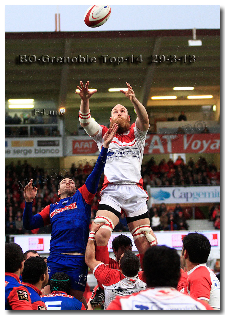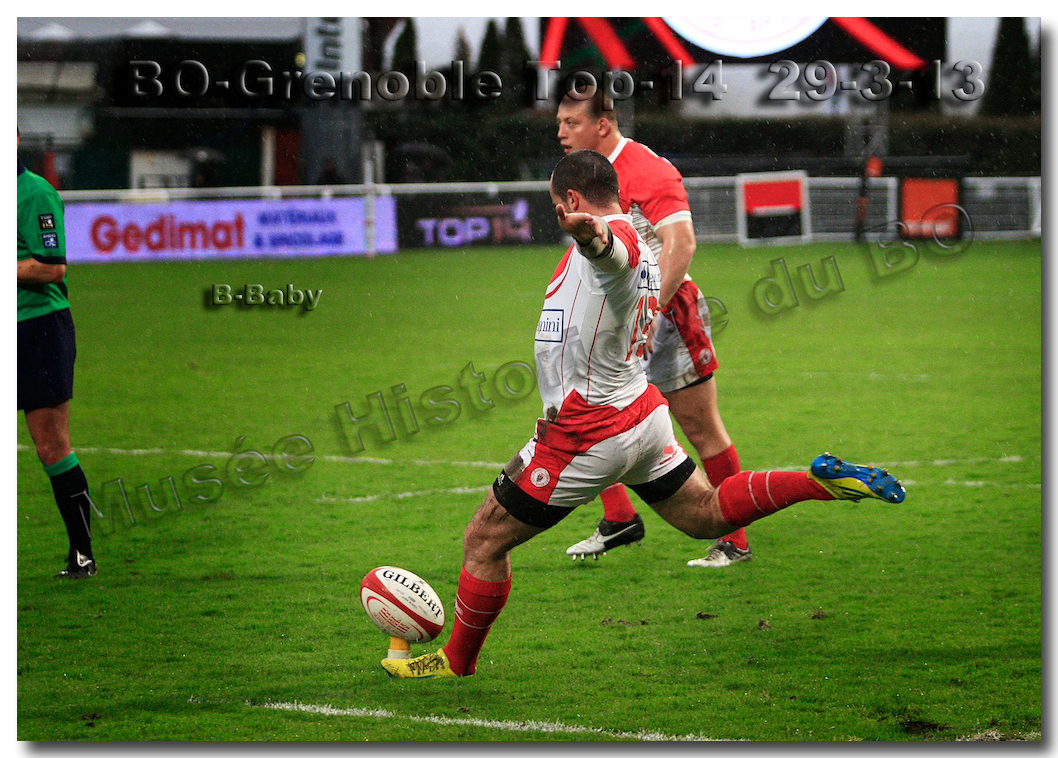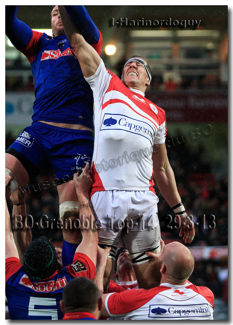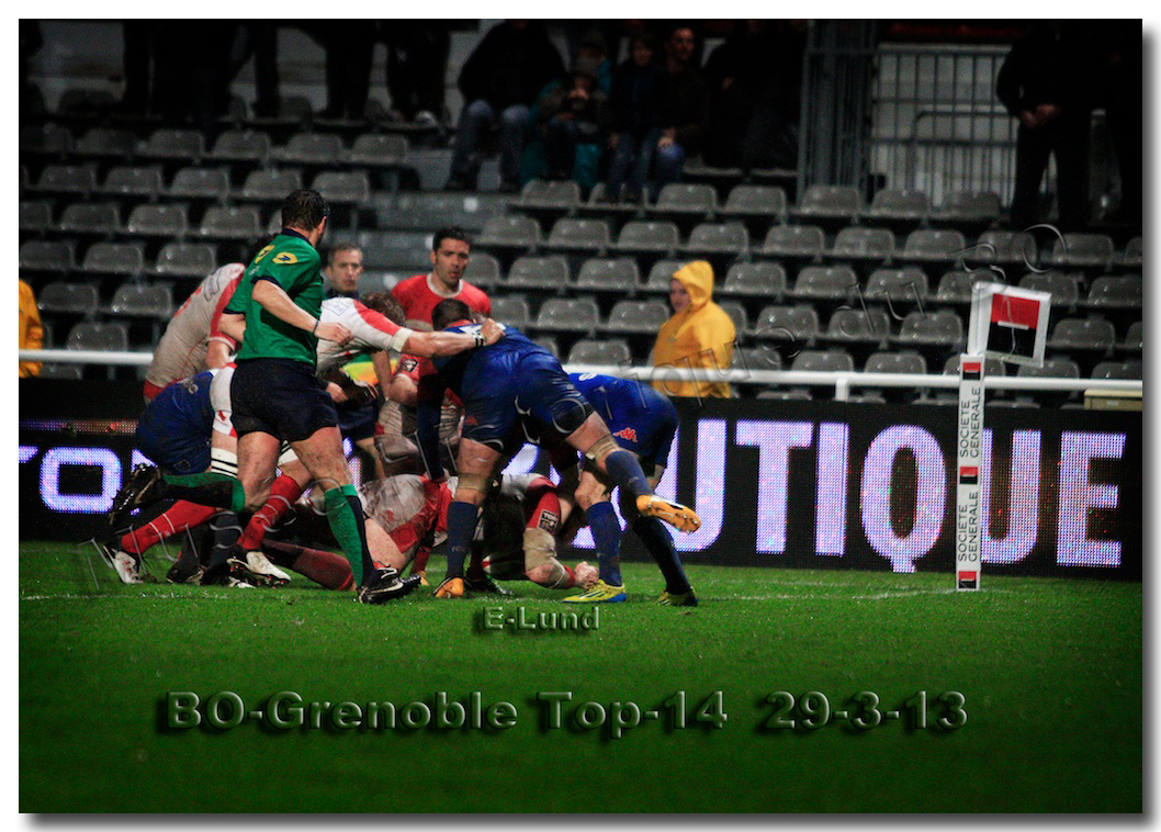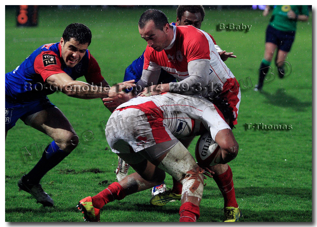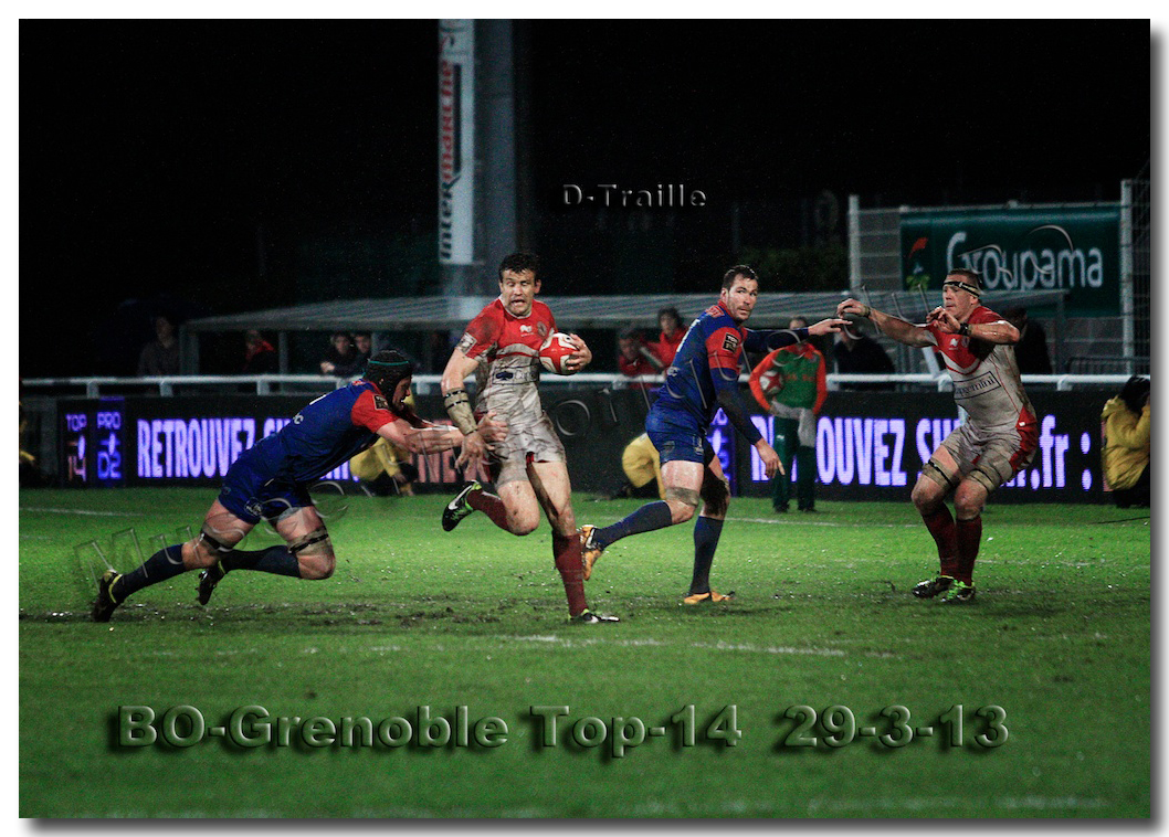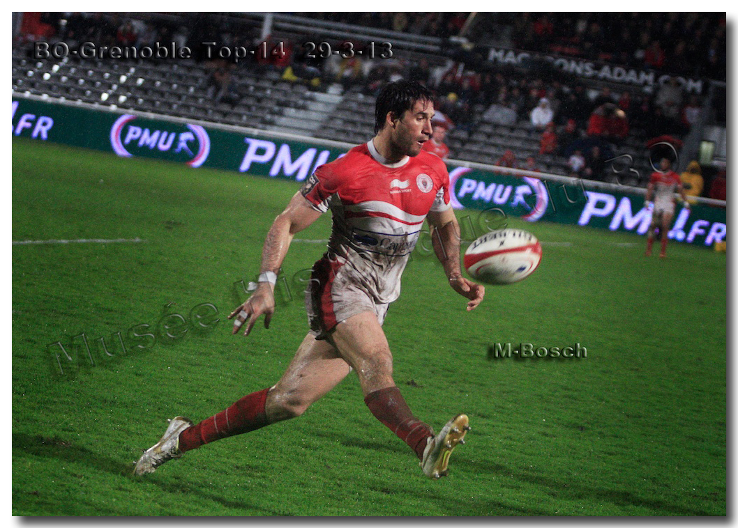 Il faisait une température printanière tout au long de la journée sur la Côte Basque. Trop beau, trop doux pour être vrai ! A l’heure de l’échauffement des équipes, patatras ! La pluie abonnée aux matches du BOPB arrivait sur Aguilera. Compagne habituelle des matches des Rouge et Blanc, elle allait à nouveau tout gâcher. Devant une équipe grenobloise accrocheuse, le BOPB se retrouvait même mené en début de deuxième mi-temps. S’appuyant sur une mêlée dominatrice, pourtant sanctionnée d’un essai de pénalisation dès la cinquième minute (allez comrendre les mystères de lamêlée !), les Rouge et Blanc allaient se détacher dans les vingt dernières minutes. Tout d’abord sur un côté fermé, Benoît Baby servait Eugen Staden pour Bosch qui décalait pour l’essai libérateur Takudzuwa N’Gwenya. C’était l’Evénément de la soirée. Depuis le 21 avril 2012 et un match face au Racing-Métro 92, « Zi » n’avait plus marqué dans son jardin d’Aguilera. Ironie de l’Histoire, presqu’un an après, il aplatissait au même endroit. Si l’assassin revient toujours sur le lieu de son crime, le chasseur d’essai semble en faire de même… Et puis à cinq minutes de la fin le chef d’œuvre est né : Dimitri Yachvili contrait un dégagement grenoblois. Le ballon roulait au sol, insaisissable sauf pour « Yachvilinho », rugbyman biarrot, devenu footballeur brésilien. D’une talonnade géniale , le numéro 9 mettait le ballon dans les bras d’Erik Lund qui avait senti le coup magique pour inscrire son premier essai pour le BOPB. De tels instants récompensent une heure et demie d’attente…sous la pluie.